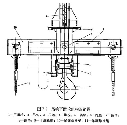 起重机配件吊钩下滑轮组由两个下滑轮、吊罐悬挂梁、吊钩及压重块等部分组成,图7-6所示的构造可供参考。